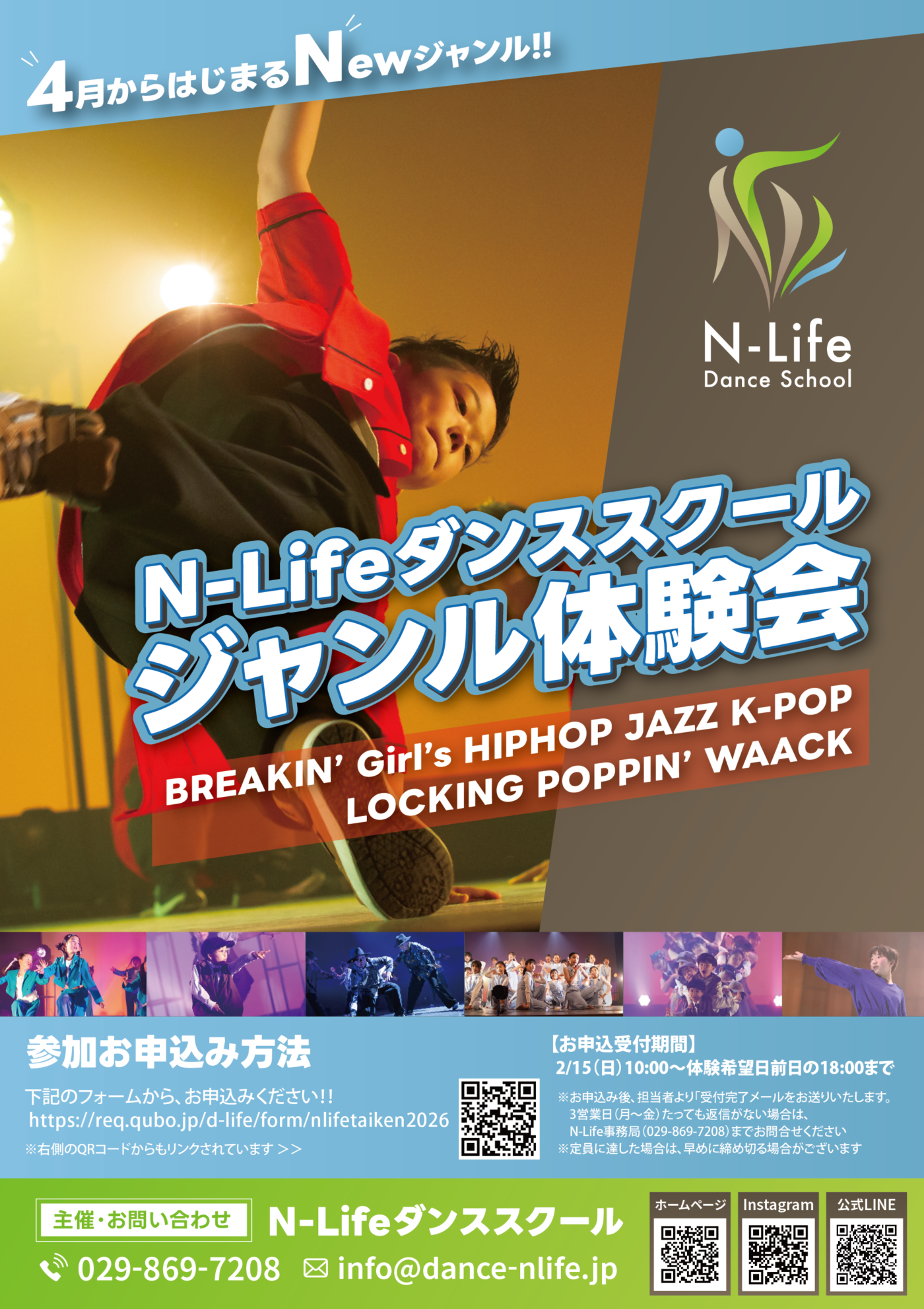 N-Lifeダンススクール 2026年度新規開講ジャンル・クラス 無料体験レッスン会 詳細はチラシをご覧ください。 4月開講に向けて、無料体験レッスン会を行います。 新しいジャンルを始め...【続きを読む】